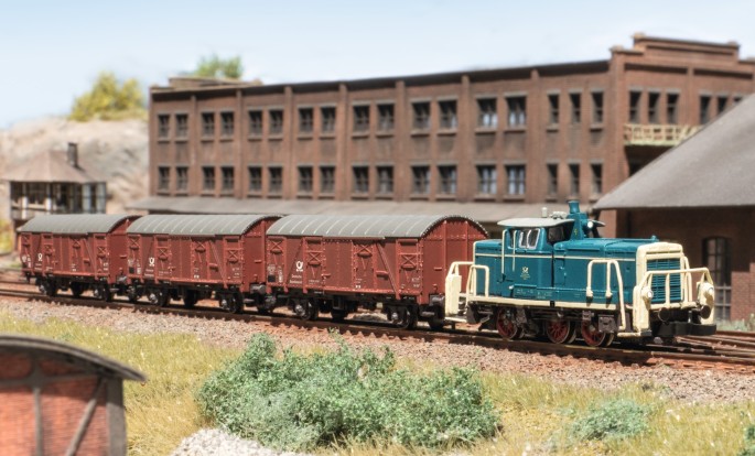 Dieses kleine Zugset stellt den typischen Post-Betriebsalltag in den Ballungszentren der Bundesrepublik nach. Damals besaß die die Post nicht nur eigene Postwagen für Reisezüge, sondern zum Beispiel auch "normale" gedeckte Güterwagen der Bauart Gbs 245 und sogar eigene Lokomotiven. Eine der größten und leistungsstärksten Loks für den Verschub der Postwagen waren die der Baureihe V60.